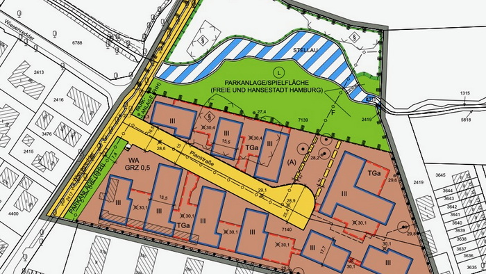 Jetzt aber soll es zügig vorangehen. Eine Genossenschaft wird dort 180 Wohnungen errichten und es wird im nördlichen Bereich der Fläche eine neue öffentlich Parkanlage mit Spielplatz entstehen. Die im Bereich des früheren Freibads verrohrte Stellau wird dort wieder einen naturnahen Bachverlauf erhalten.